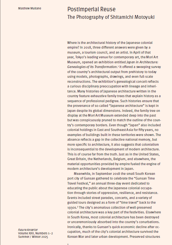 +Article / “Postimperial Reuse: The Photography of Shitamichi Motoyuki,” Future Anterior, vol. 22, no. 1-2 (Summer / Winter 2025): 1-15.